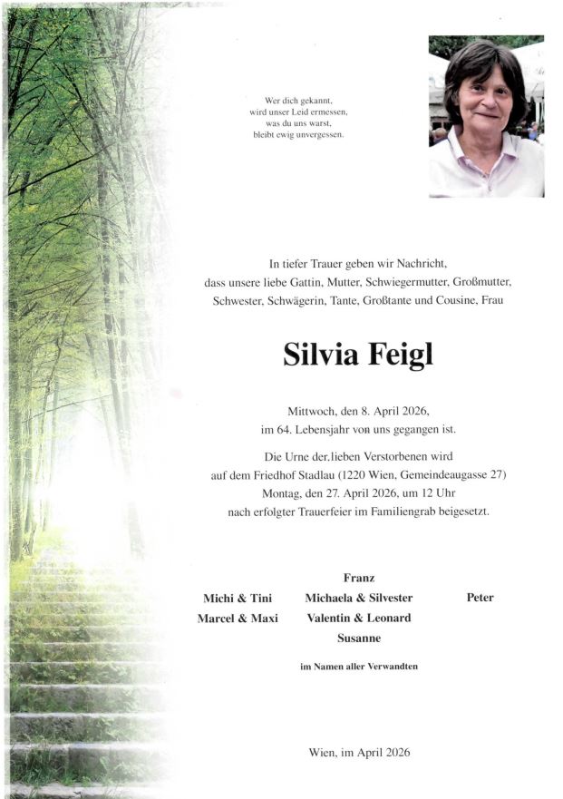Mit tiefer Trauer nehmen wir Abschied von Silvia Feigl, die am 08. April von uns gegangen ist.